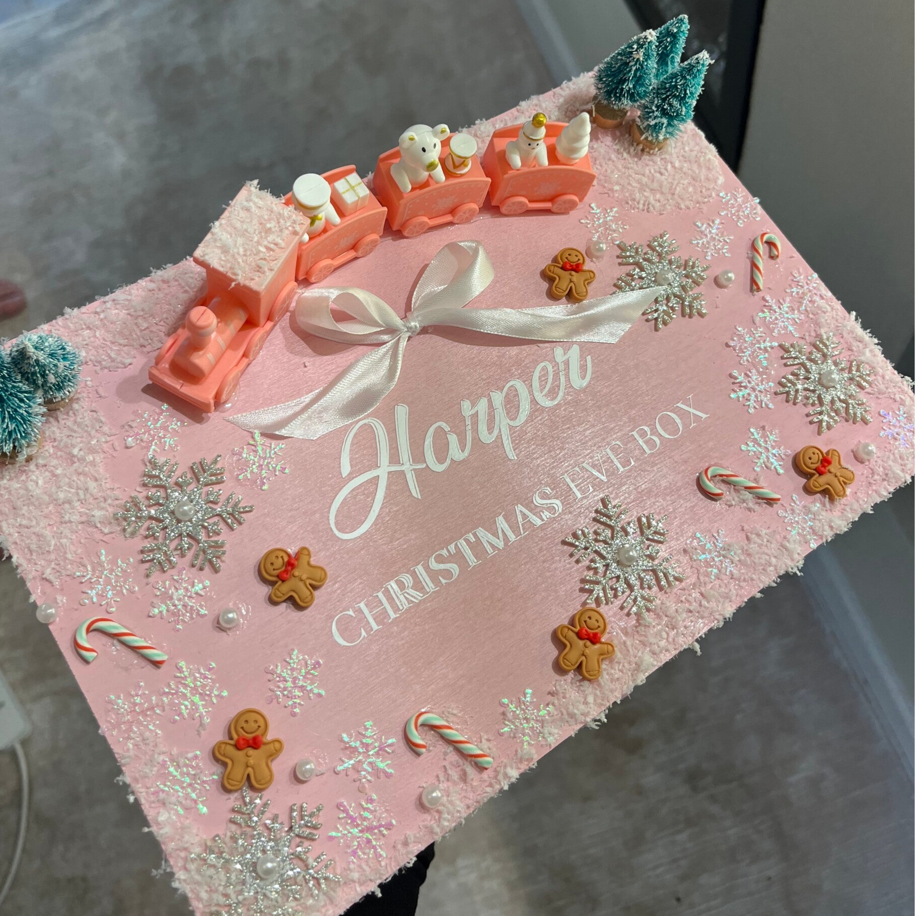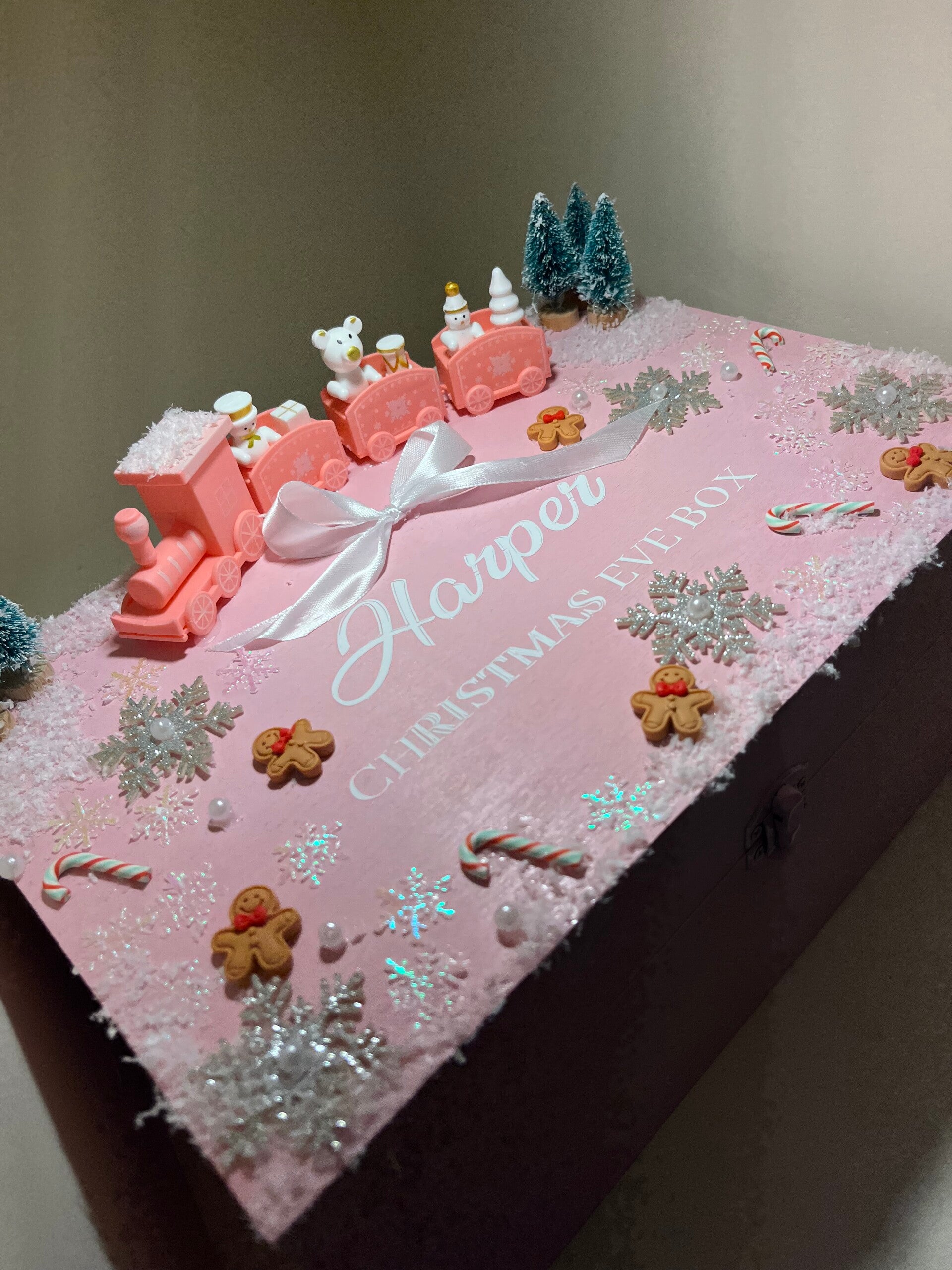 Our sprayed wooden toy box with snowflake and snow detail as pictured