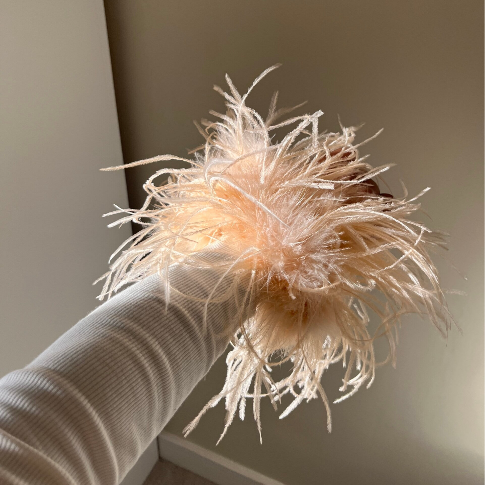white longs sleeve backless nude pink feather cuff detail mini dress
