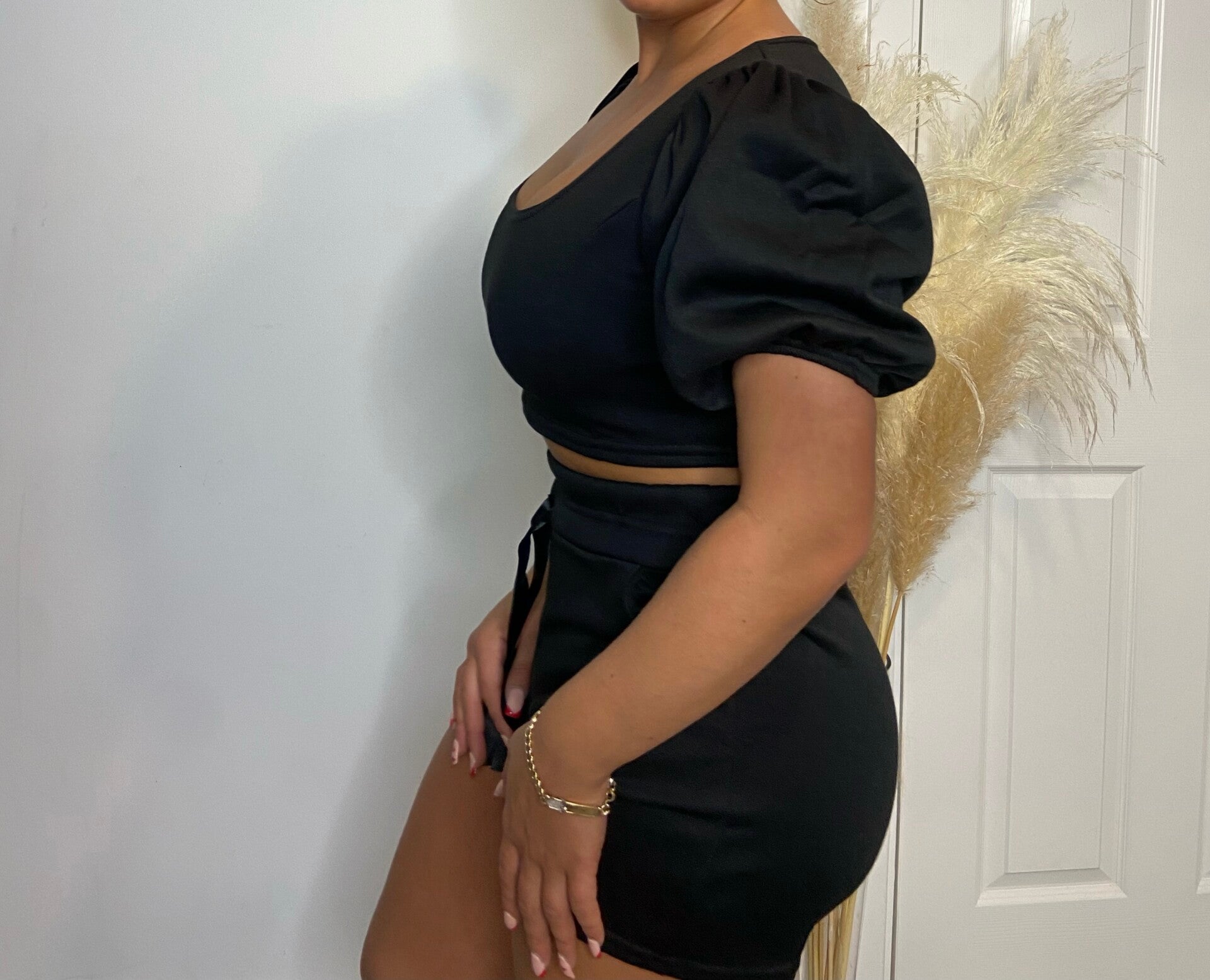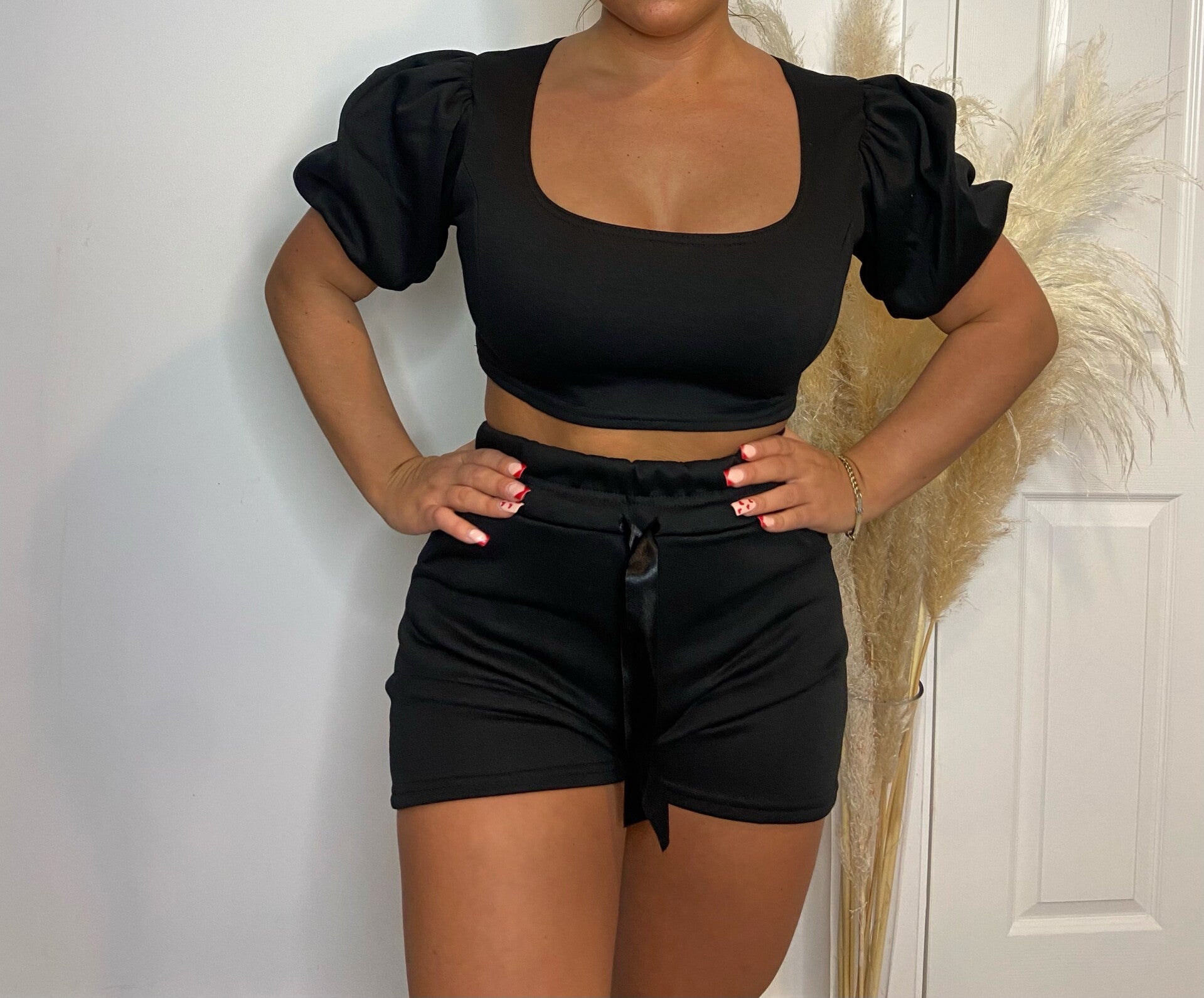 Dolly co-ord in black puff sleeve shoulders and ribbon detail shorts.